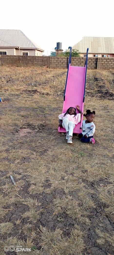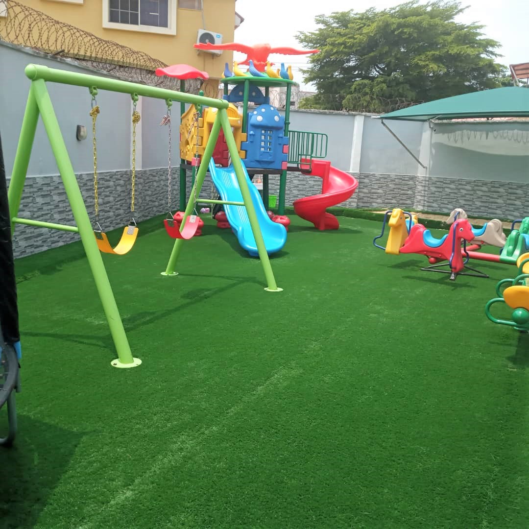 Slide, seesaw, merry go round, swing and trampoline.